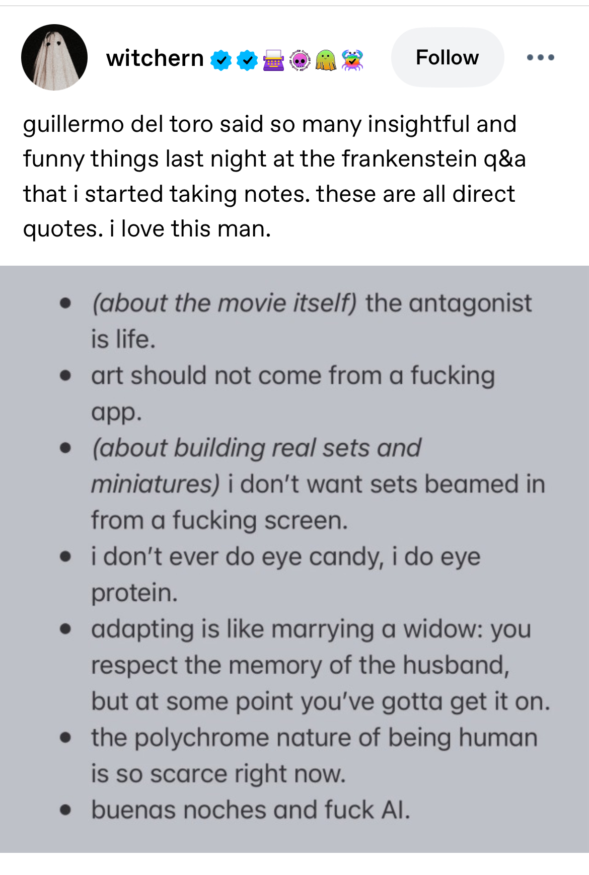 guillermo del toro said so many insightful and funny things last night at the frankenstein q&a that i started taking notes. these are all direct quotes. i love this man.