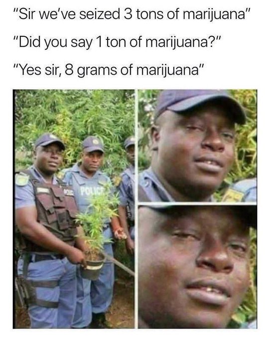 Four Nigerian police officers in blue uniforms and caps stand outdoors near green foliage holding a small potted marijuana plant about one foot tall with broad leaves. One officer in the center holds the plant pot while others stand around him smiling. The close-up panel shows one officers face with a serious expression looking directly at the viewer.